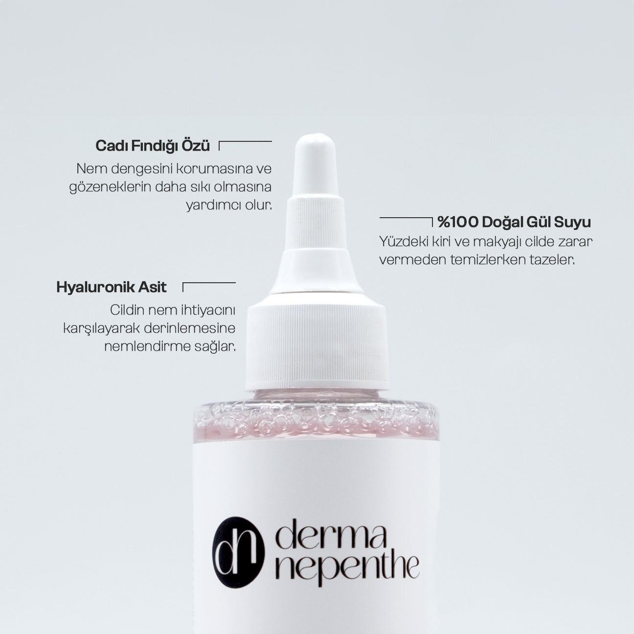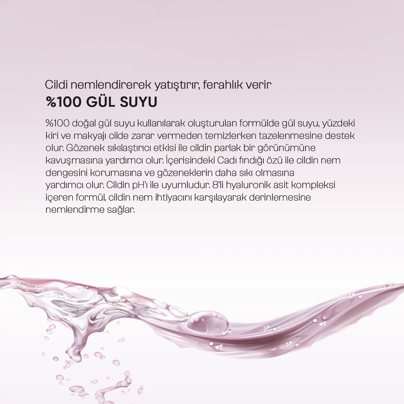 - Doğal İçerik: %100 doğal gül suyu içeren formül, yüzdeki kiri ve makyajı cilde zarar vermeden temizlerken tazelenmesine destek olur.