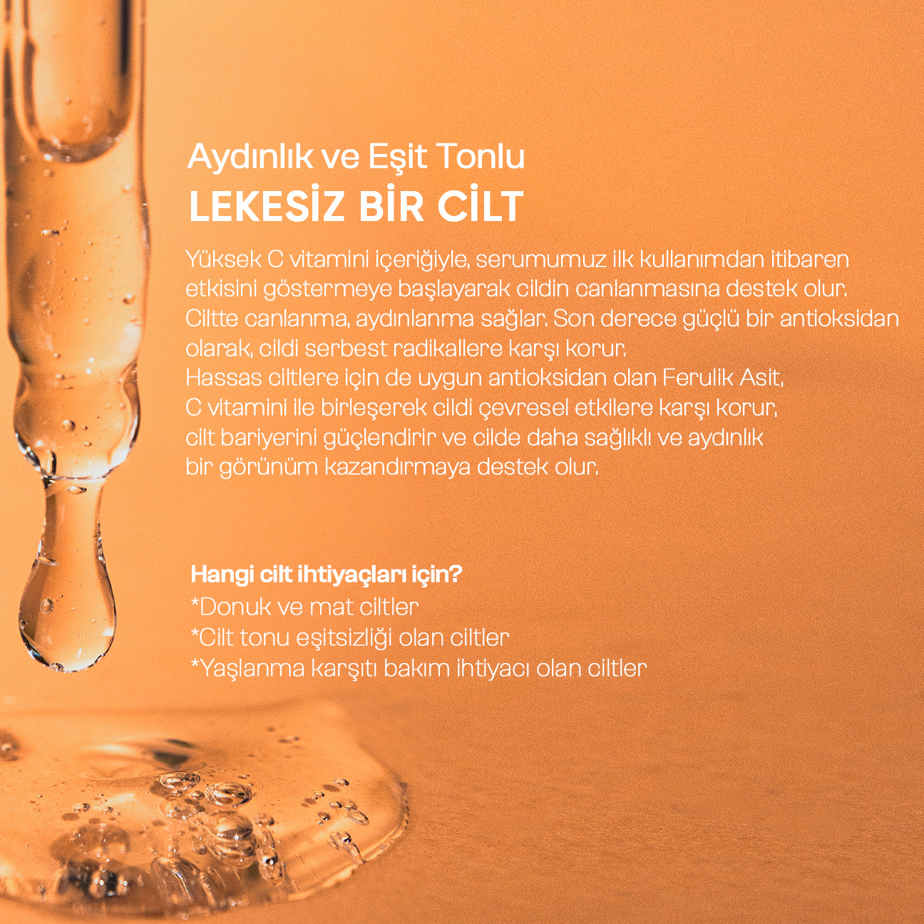 - Yüksek C Vitamini İçeriği: Serumumuz, yüksek C vitamini içeriğiyle ilk kullanımdan itibaren cildin canlanmasına destek olur.