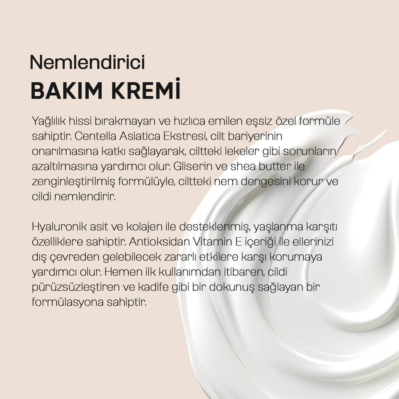 Nemlendirici Bakım Kremi, kuru ve karma ciltler için mükemmel bir çözümdür. Kolajen ve E vitamini içeren zengin formülü, cildi derinlemesine nemlendirir, besler ve korur. Centella Asiatica Ekstresi ile cilt bariyerini onarır, hyaluronik asit ve kolajen ile yaşlanma belirtilerine karşı mücadele eder. E vitamini ile cildi serbest radikallerden korur ve ilk kullanımdan itibaren cildi pürüzsüzleştirir. Hoş kokusuyla, cilt bakımınızı keyifli bir ritüele dönüştürür.