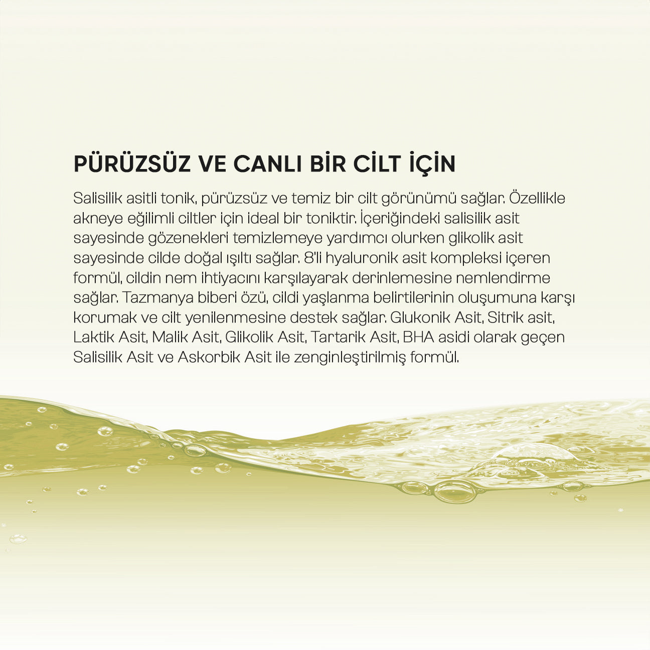 - Pürüzsüz ve Temiz Cilt: Salisilik asitli tonik, cildinizde pürüzsüz ve temiz bir görünüm sağlar.