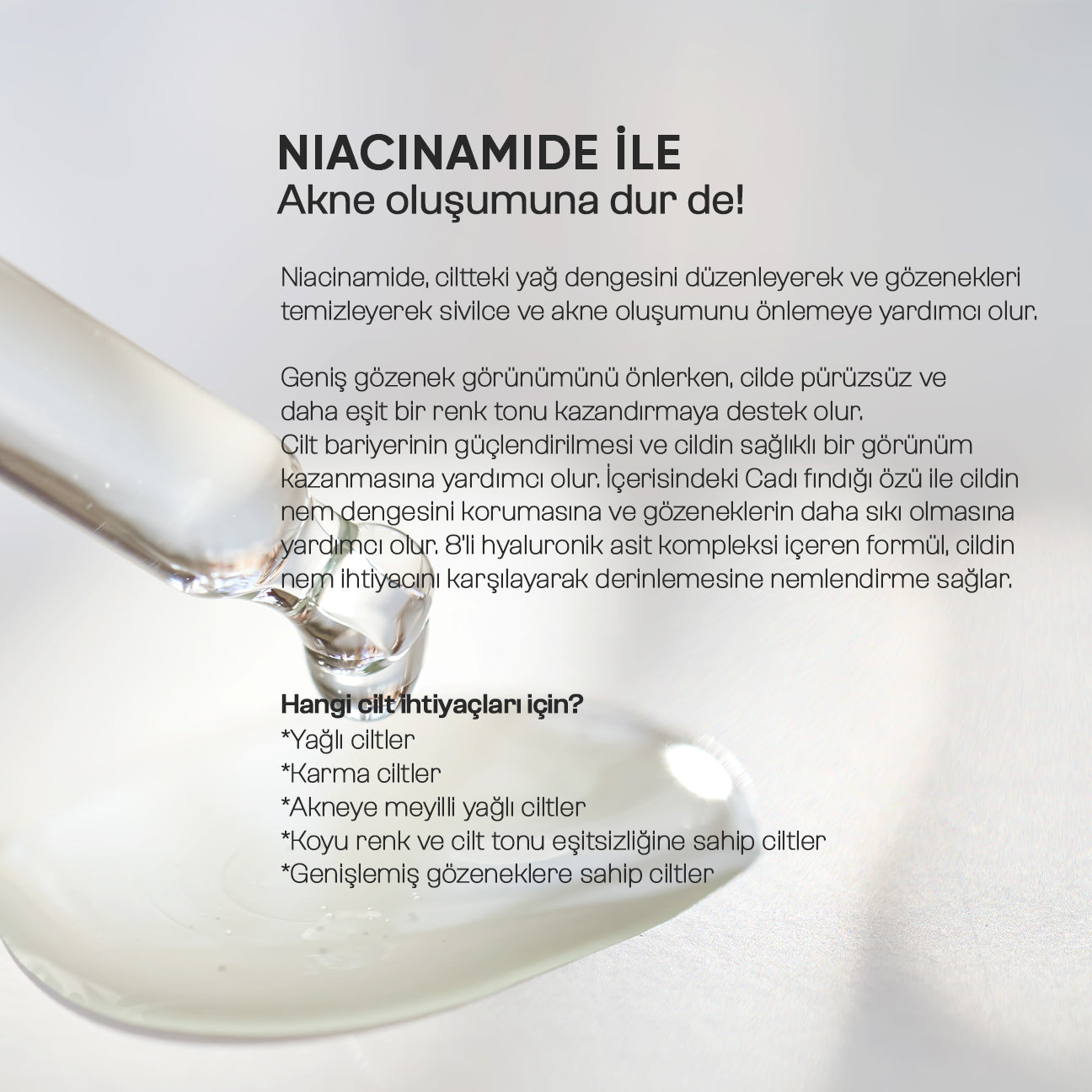 • Niacinamide, ciltteki yağ dengesini düzenleyerek ve gözenekleri temizleyerek sivilce ve akne oluşumunu önlemeye yardımcı olur.