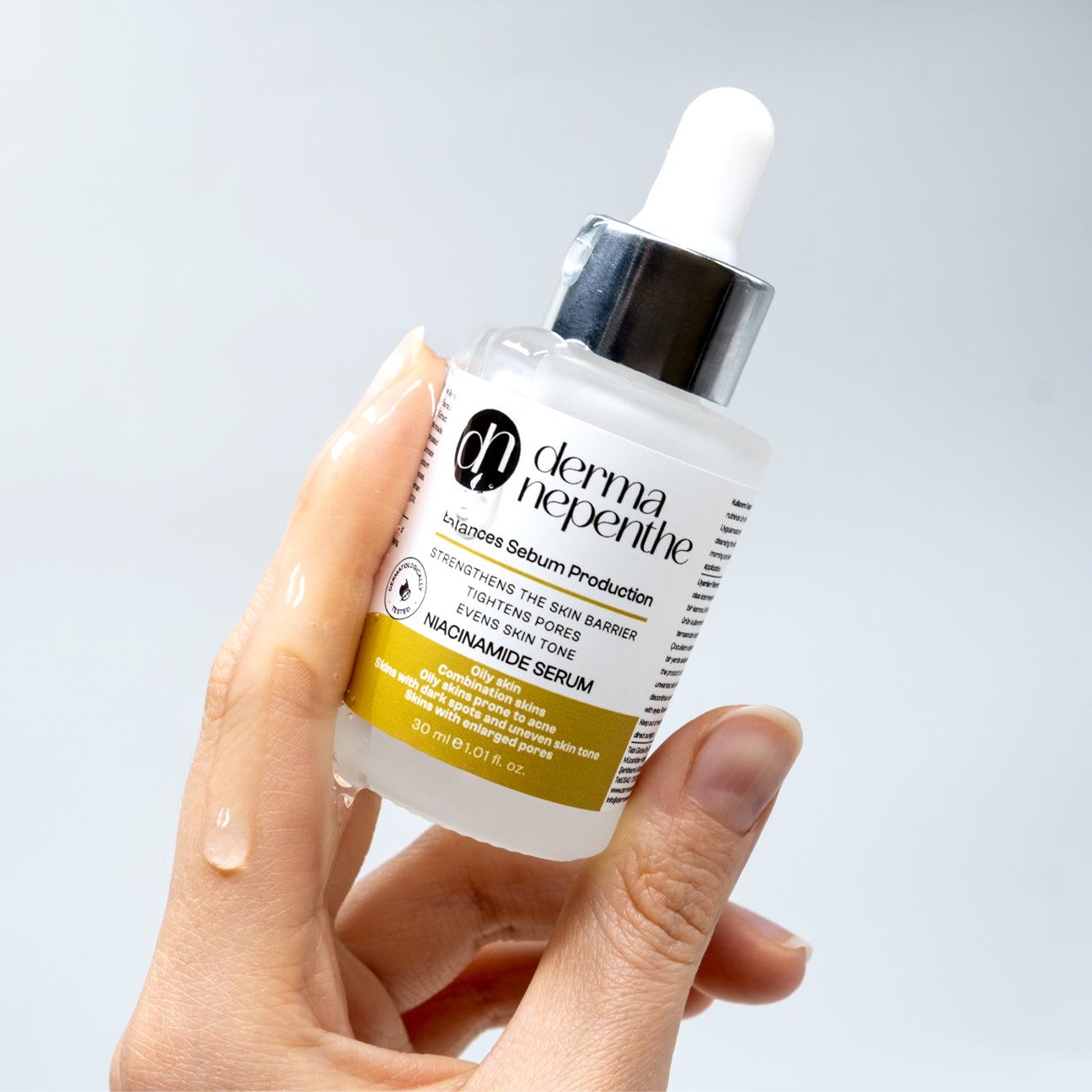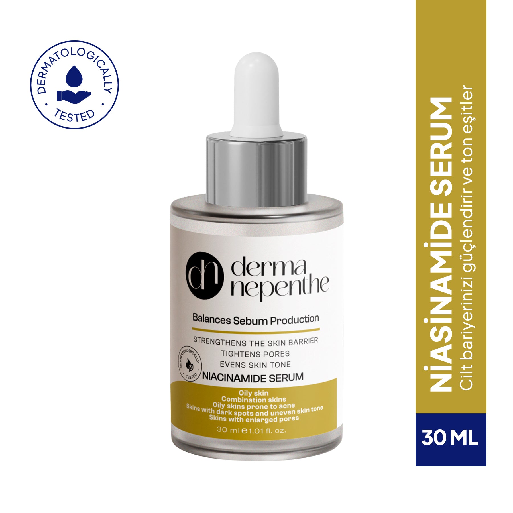 Niacinamide serum, yağlı ve akneye meyilli ciltler için ideal olup, cildin sebum dengesini sağlar, gözenekleri sıkılaştırır ve cilt tonunu eşitler.