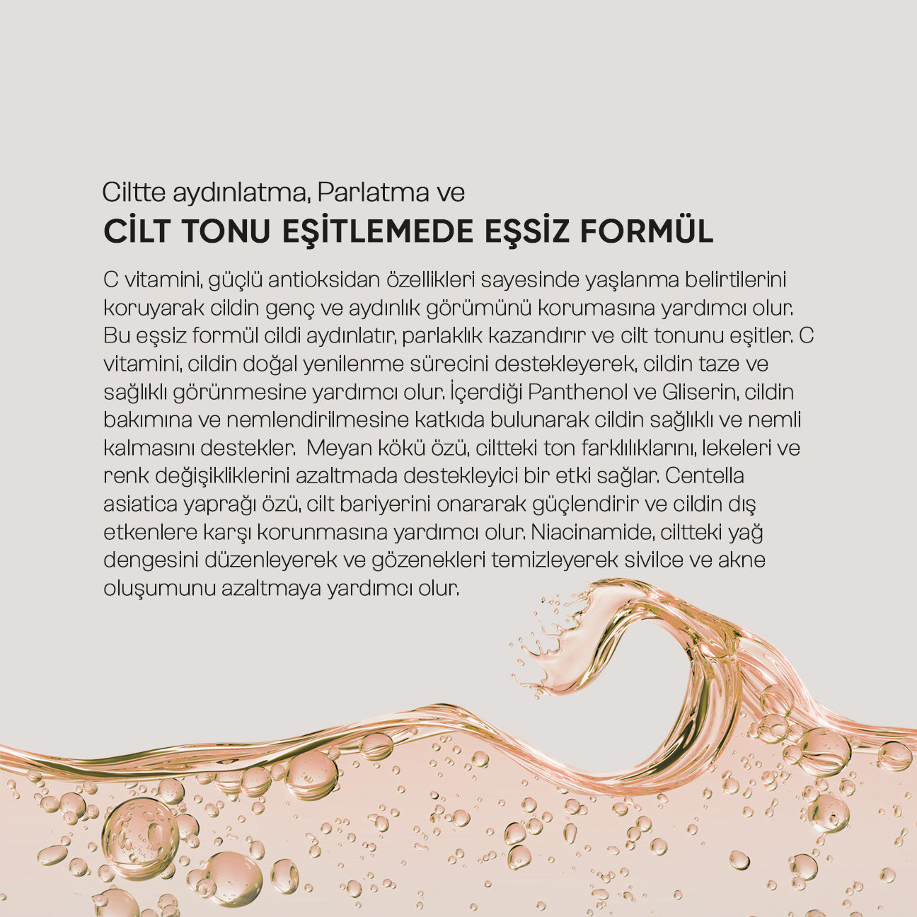 - Ana Bileşenler: Vitamin C, Pro Vitamin B5 (Panthenol), Centella Asiatica, Niacinamide